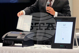 FILE - A Smartmatic representative demonstrates his company's system which has scanners and touch screens with printout options, at a meeting of the Secure, Accessible & Fair Elections Commission, Aug. 30, 2018, in Grovetown, Ga. (Bob Andres/Atlanta Journal-Constitution via AP, File)