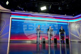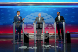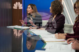 From left, WNJU news anchor Rosarina Breton, POLITICO senior politics editor Sally Goldenberg, WNBC political reporter Melissa Russo and WNBC news anchor David Ushery moderate a mayoral debate between independent candidate former New York Gov. Andrew Cuomo Republican candidate Curtis Sliwa and Democratic candidate Zohran Mamdani, Thursday, Oct. 16, 2025, in New York. (AP Photo/Angelina Katsanis, Pool)