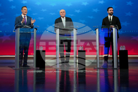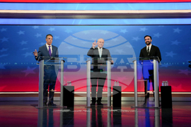 Independent candidate former New York Gov. Andrew Cuomo, left, speaks during a mayoral debate with Republican candidate Curtis Sliwa, center, and Democratic candidate Zohran Mamdani, Thursday, Oct. 16, 2025, in New York. (AP Photo/Angelina Katsanis, Pool)
