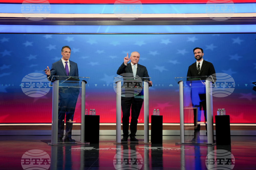 From left, Mayoral candidates Independent candidate former New York Gov. Andrew Cuomo, Republican candidate Curtis Sliwa and Democratic candidate Zohran Mamdani participate in a mayoral debate, Thursday, Oct. 16, 2025, in New York. (AP Photo/Angelina Katsanis, Pool)