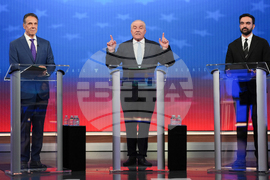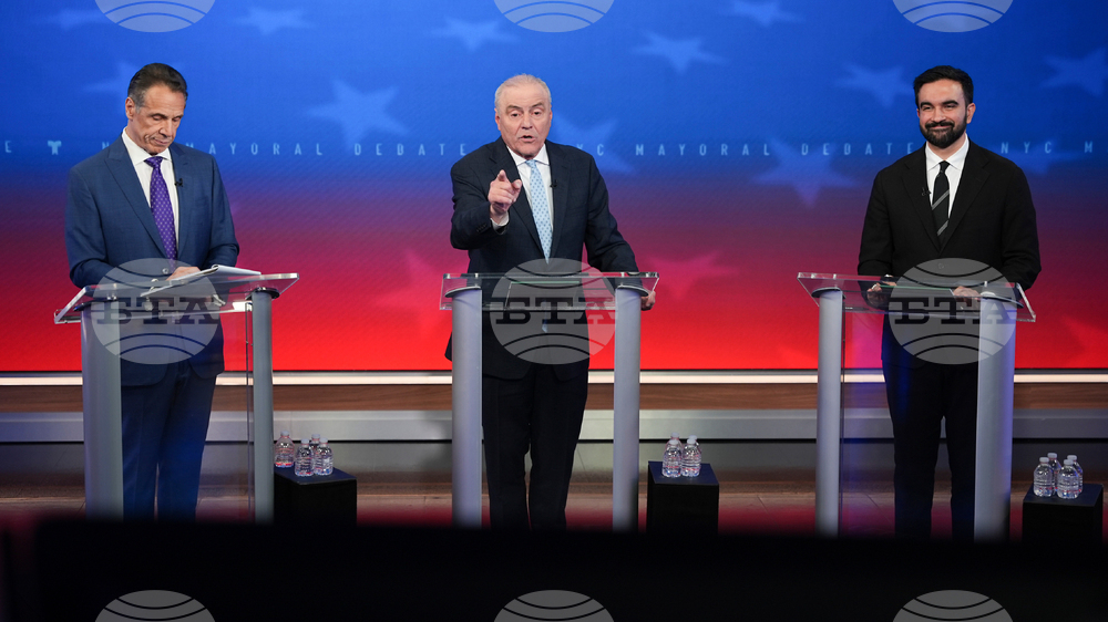 From left, Independent candidate former New York Gov. Andrew Cuomo, Republican candidate Curtis Sliwa and Democratic candidate Zohran Mamdani participate in a mayoral debate, Thursday, Oct. 16, 2025, in New York. (AP Photo/Angelina Katsanis, Pool)