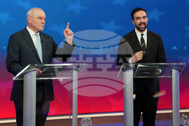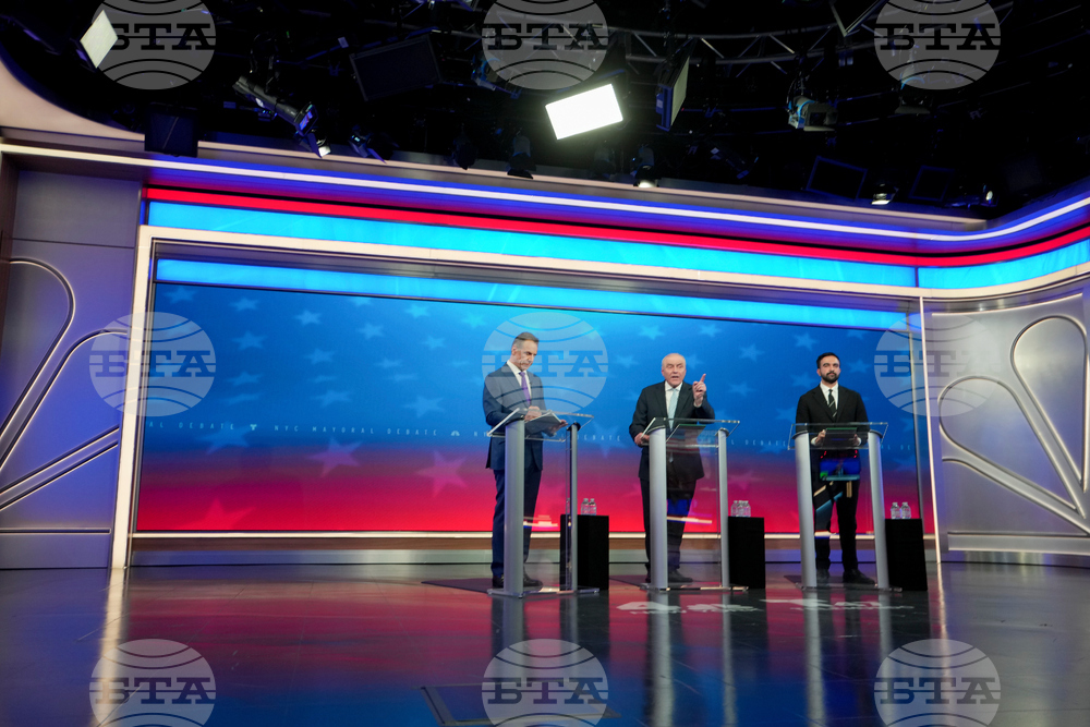 Republican candidate Curtis Sliwa, left, speaks while participating in a mayoral debate with Democratic candidate Zohran Mamdani, right, and independent candidate former New York Gov. Andrew Cuomo (not pictured), Thursday, Oct. 16, 2025, in New York. (AP Photo/Angelina Katsanis, Pool)