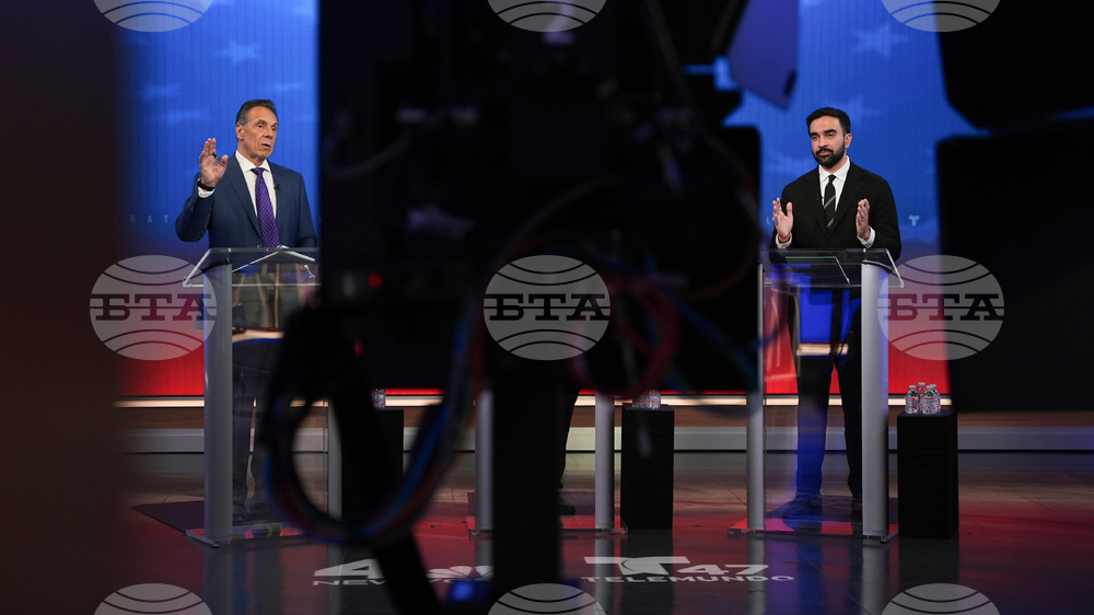 Democratic candidate Zohran Mamdani, right, speaks during a mayoral debate with Republican candidate Curtis Sliwa, center, and independent candidate former New York Gov. Andrew Cuomo, Thursday, Oct. 16, 2025, in New York. (AP Photo/Angelina Katsanis, Pool)