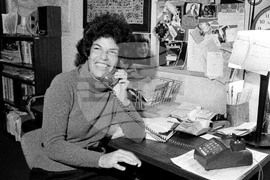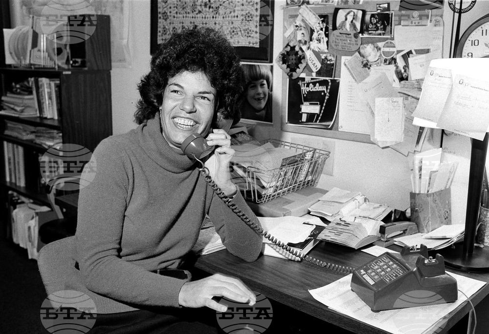 FILE - National Public Radio staffer Susan Stamberg holds a phone in her Washington D.C. office, Oct. 13, 1979. (AP Photo/Barry Thumma, File)