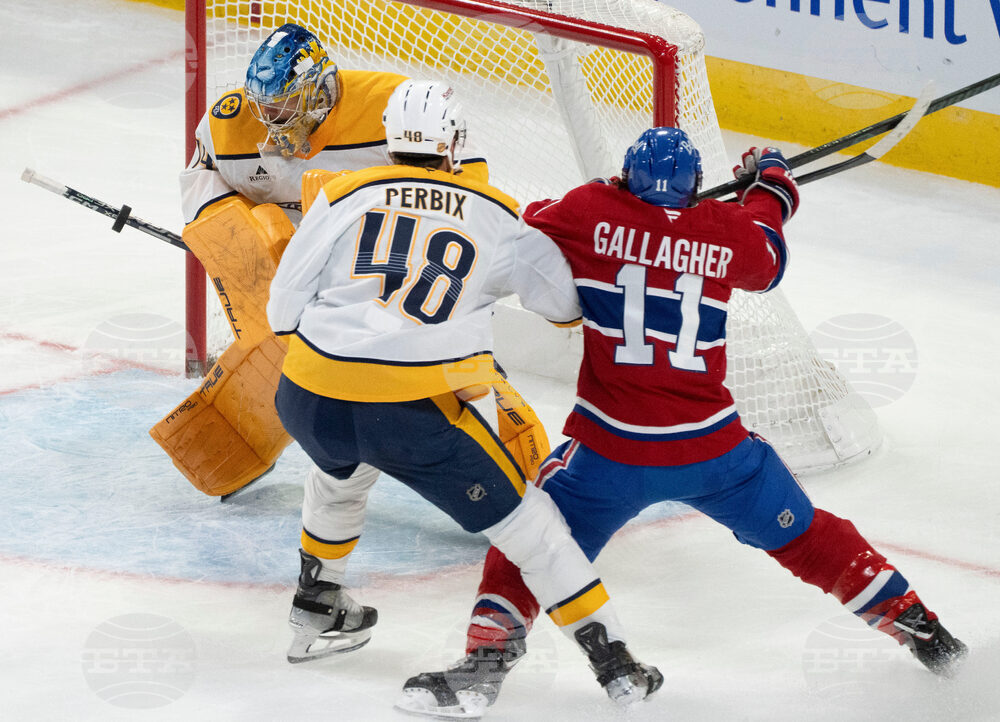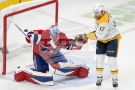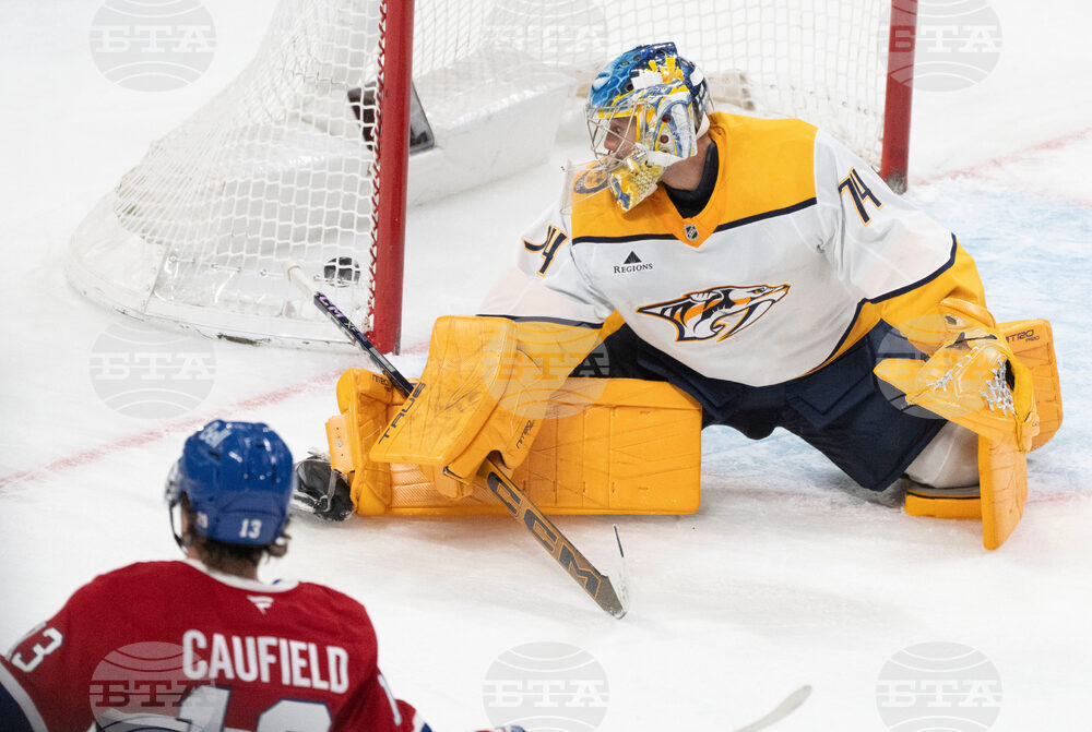 Montreal Canadiens goaltender Jakub Dobes (75) deflects the puck against Nashville Predators' Tyson Jost (17) during second period NHL hockey action in Montreal on Thursday, Oct. 16, 2025. (Christinne Muschi/The Canadian Press via AP)