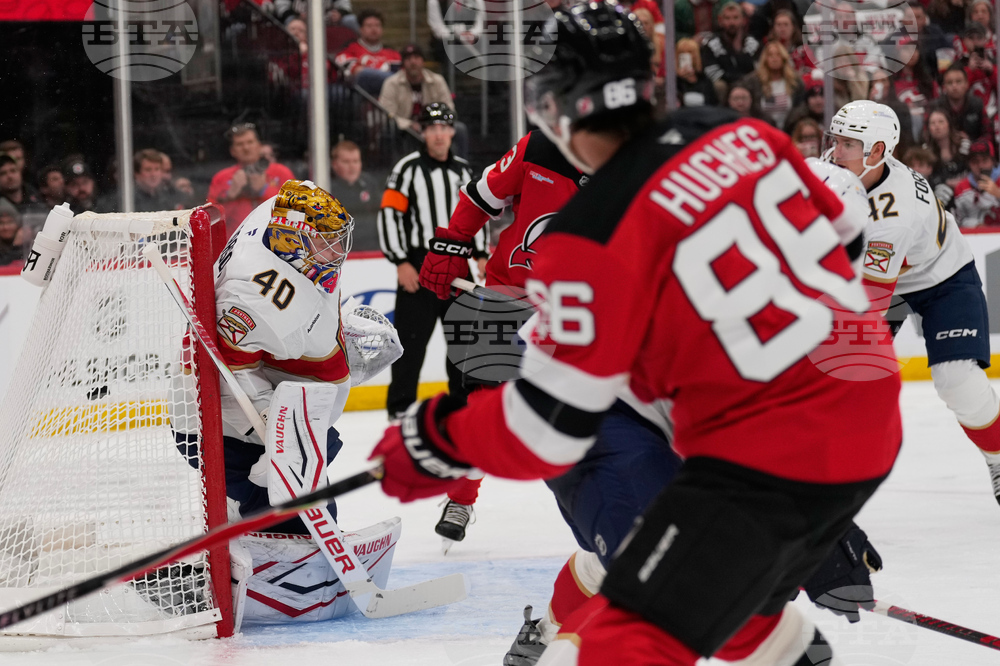 New Jersey Devils' Jack Hughes (86), right foreground, scores past Florida Panthers goaltender Daniil Tarasov during the second period of an NHL hockey game Thursday, Oct. 16, 2025, in Newark, N.J. (AP Photo/Seth Wenig)