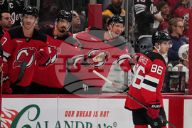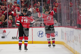 New Jersey Devils celebrates a goal by Jack Hughes (86), right, during the second period of an NHL hockey game against the Florida Panthers Thursday, Oct. 16, 2025, in Newark, N.J. (AP Photo/Seth Wenig)