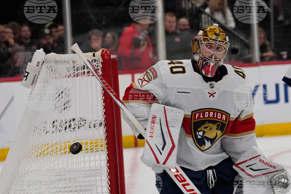 Florida Panthers goaltender Daniil Tarasov makes a save during the second period of an NHL hockey game against the New Jersey Devils Thursday, Oct. 16, 2025, in Newark, N.J. (AP Photo/Seth Wenig)