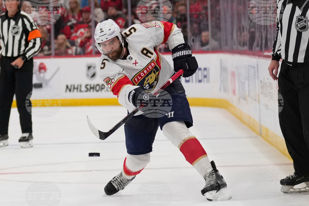 Florida Panthers' Aaron Ekblad moves the puck up the ice during the third period of an NHL hockey game against the New Jersey Devils Thursday, Oct. 16, 2025, in Newark, N.J. (AP Photo/Seth Wenig)