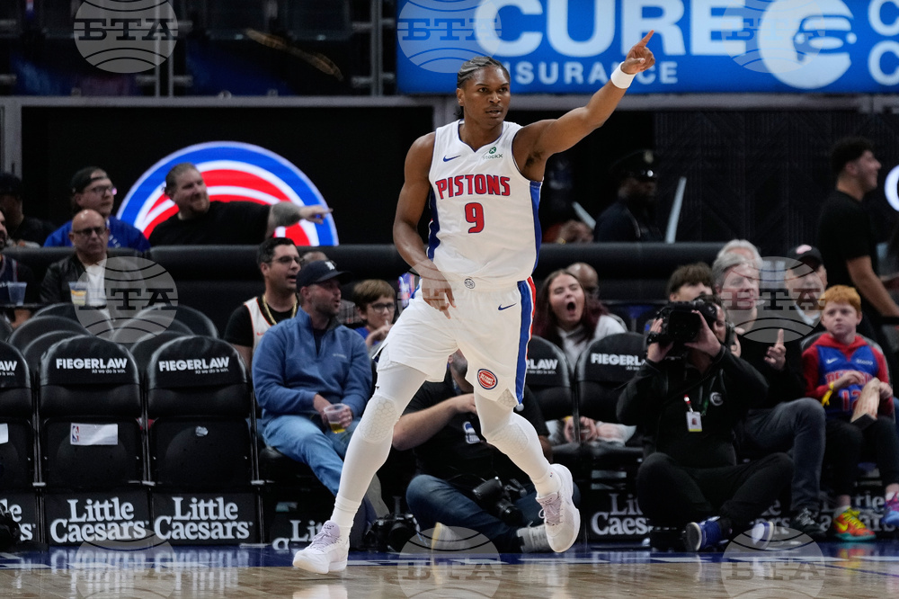 Detroit Pistons guard/forward Ausar Thompson gestures after scoring during the first half of a preseason NBA basketball game against the Washington Wizards, Thursday, Oct. 16, 2025, in Detroit. (AP Photo/Ryan Sun)