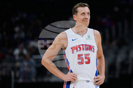 Detroit Pistons forward Duncan Robinson reacts during the first half of a preseason NBA basketball game against the Washington Wizards, Thursday, Oct. 16, 2025, in Detroit. (AP Photo/Ryan Sun)