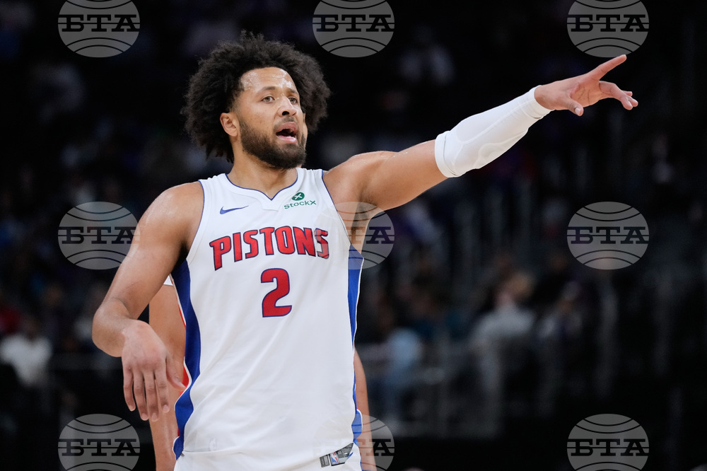 Detroit Pistons guard Cade Cunningham gestures during the first half of a preseason NBA basketball game against the Washington Wizards Thursday, Oct. 16, 2025, in Detroit. (AP Photo/Ryan Sun)