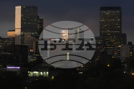 The skyline is illuminated as the sun sets Thursday, Oct. 16, 2025, in Denver. (AP Photo/David Zalubowski)