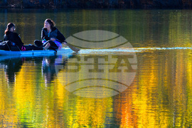 Santiago Argo, left, and Teddie Urioste glide across Quail Lake on their paddle board as the fall colors reflect on the water, Friday, Oct. 17, 2025, in Colorado Springs, Colo. (AP Photo/The Gazette, Christian Murdock)