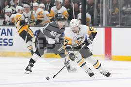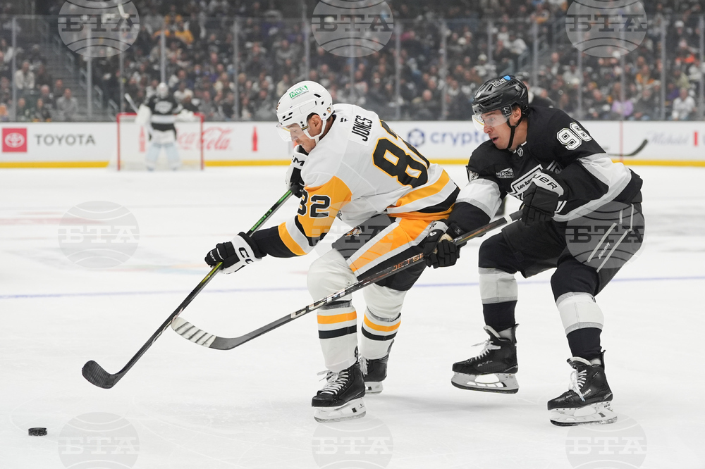 Pittsburgh Penguins defenseman Caleb Jones (82) moves the puck away from Los Angeles Kings left wing Andrei Kuzmenko (96) during the second period of an NHL hockey game Thursday, Oct. 16, 2025, in Los Angeles. (AP Photo/Jae C. Hong)
