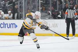 Pittsburgh Penguins right wing Bryan Rust (17) attempts a shot during the first period of an NHL hockey game against the Los Angeles Kings Thursday, Oct. 16, 2025, in Los Angeles. (AP Photo/Jae C. Hong)