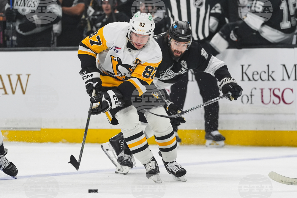 Pittsburgh Penguins center Sidney Crosby (87) is defended by Los Angeles Kings defenseman Drew Doughty (8) during the first period of an NHL hockey game Thursday, Oct. 16, 2025, in Los Angeles. (AP Photo/Jae C. Hong)
