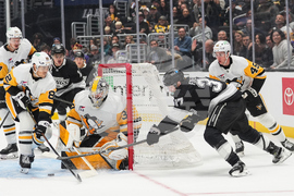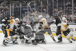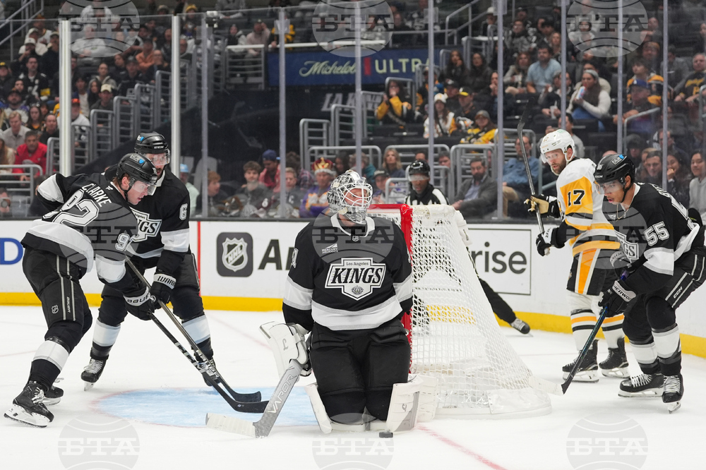 Players scramble for the puck during the first period of an NHL hockey game between the Los Angeles Kings and the Pittsburgh Penguins Thursday, Oct. 16, 2025, in Los Angeles. (AP Photo/Jae C. Hong)