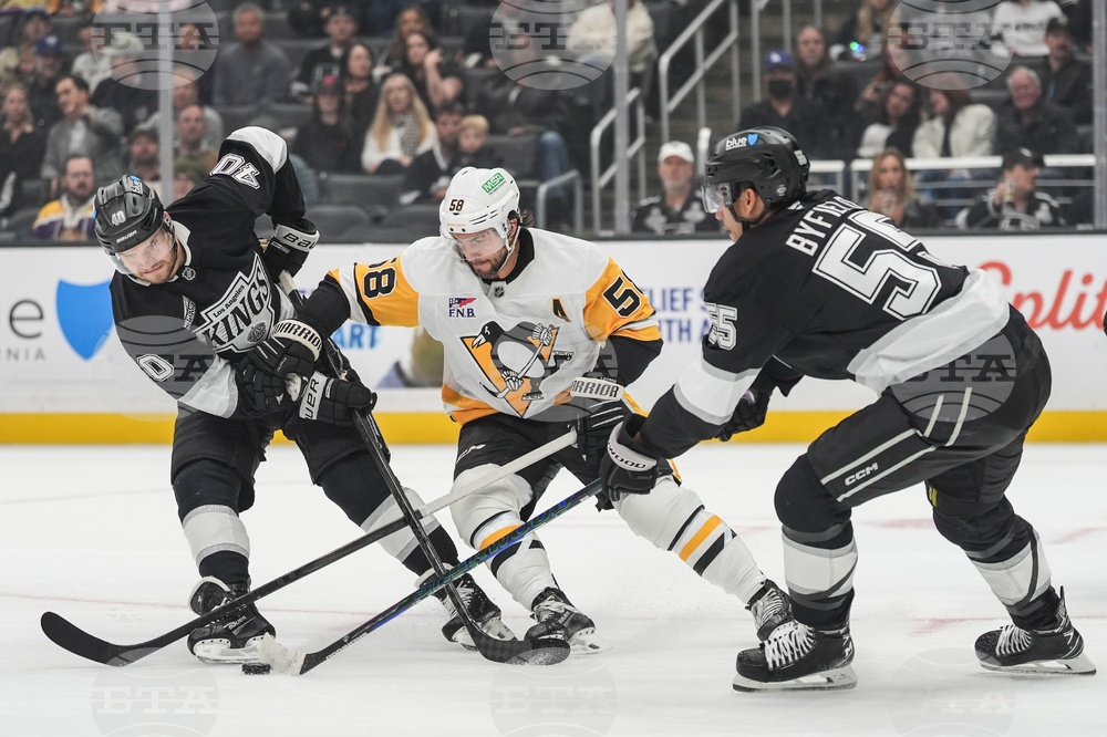 Pittsburgh Penguins defenseman Kris Letang (58) fights for the puck with Los Angeles Kings right wing Joel Armia (40) and Los Angeles Kings right wing Quinton Byfield (55) during the first period of an NHL hockey game Thursday, Oct. 16, 2025, in Los Angeles. (AP Photo/Jae C. Hong)