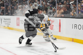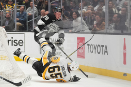 Los Angeles Kings defenseman Mikey Anderson (44) is checked by Pittsburgh Penguins right wing Justin Brazeau (16) during the first period of an NHL hockey game Thursday, Oct. 16, 2025, in Los Angeles. (AP Photo/Jae C. Hong)