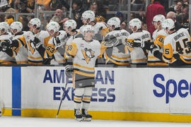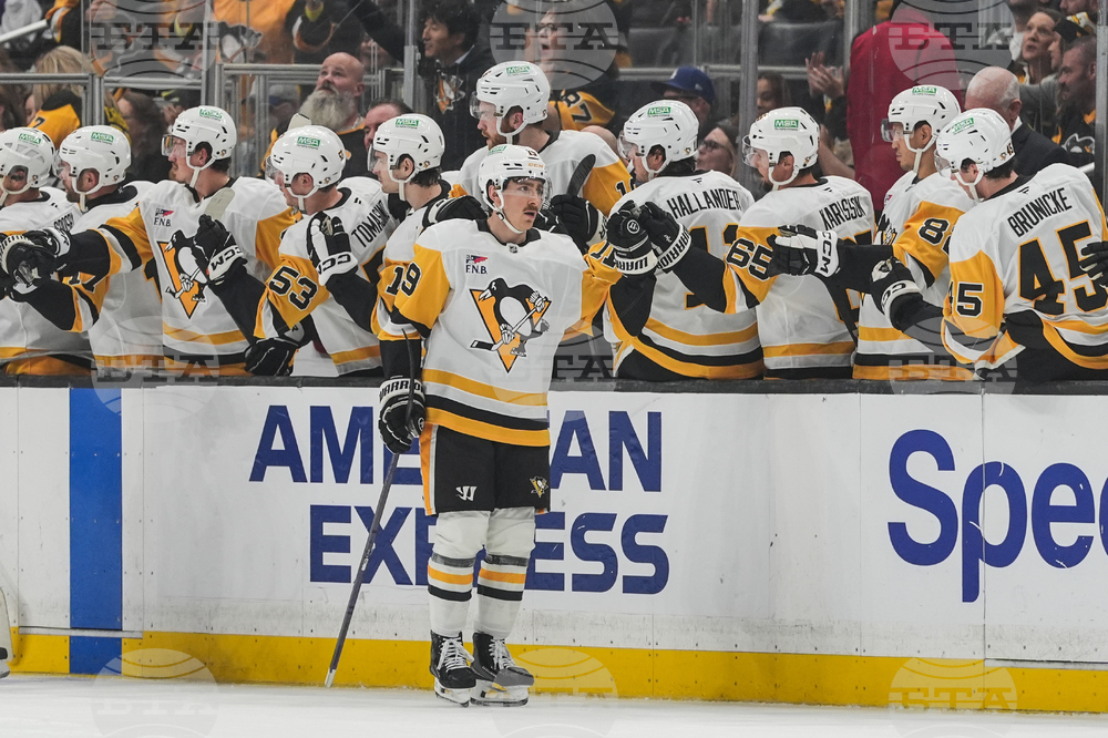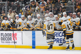 Pittsburgh Penguins center Sidney Crosby (87) celebrates his empty-net goal with teammates during the third period of an NHL hockey game against the Los Angeles Kings Thursday, Oct. 16, 2025, in Los Angeles. (AP Photo/Jae C. Hong)