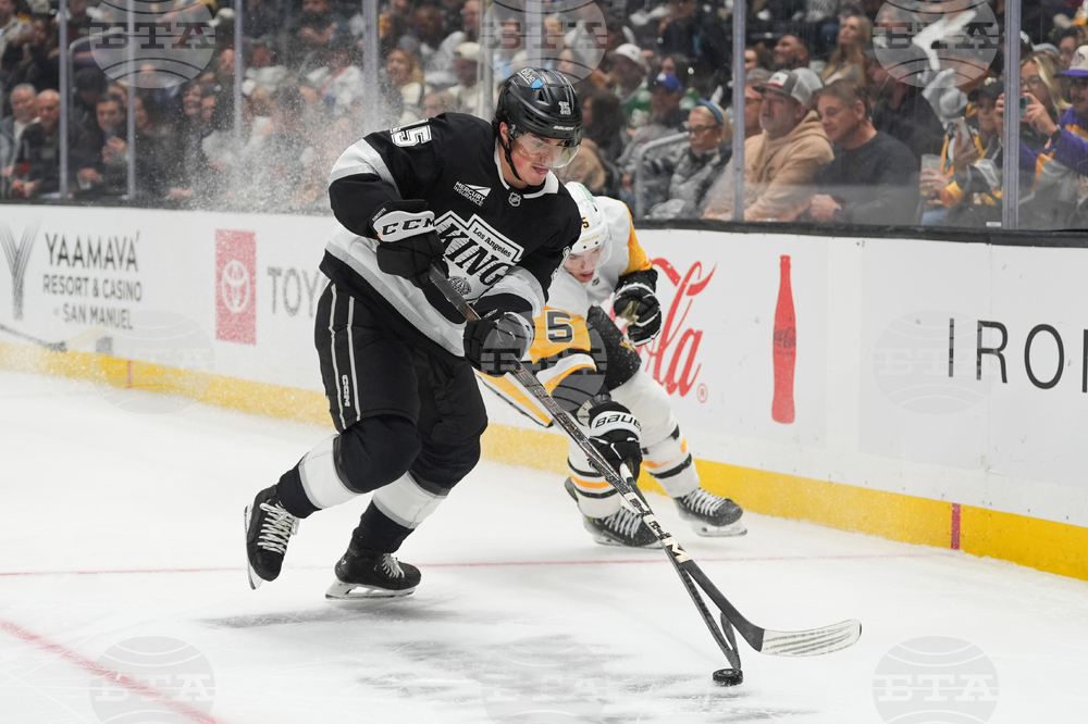 Los Angeles Kings center Samuel Helenius (79) moves the puck away from Pittsburgh Penguins right wing Justin Brazeau (16) during the first period of an NHL hockey game Thursday, Oct. 16, 2025, in Los Angeles. (AP Photo/Jae C. Hong)