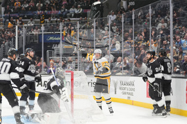 Los Angeles Kings players celebrate a goal by Warren Foegele (37) during the first period of an NHL hockey game against the Pittsburgh Penguins Thursday, Oct. 16, 2025, in Los Angeles. (AP Photo/Jae C. Hong)