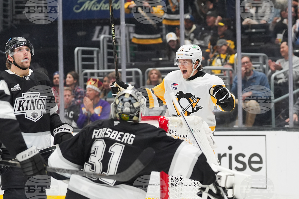 Pittsburgh Penguins center Filip Hallander, right, celebrates his goal against Los Angeles Kings goaltender Anton Forsberg (31) during the third period of an NHL hockey game Thursday, Oct. 16, 2025, in Los Angeles. (AP Photo/Jae C. Hong)