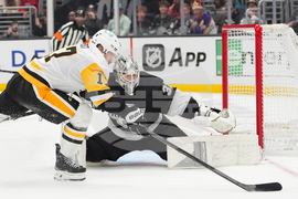 Los Angeles Kings left wing Warren Foegele (37) attempts a shot under defense by Pittsburgh Penguins defenseman Parker Wotherspoon (28) during the second period of an NHL hockey game Thursday, Oct. 16, 2025, in Los Angeles. (AP Photo/Jae C. Hong)