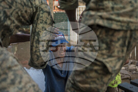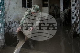 Mexican marines help clean a flooded house in Poza Rica, Veracruz state, Mexico, Thursday, Oct. 16, 2025, after deadly floods and torrential rain. (AP Photo/Felix Marquez)