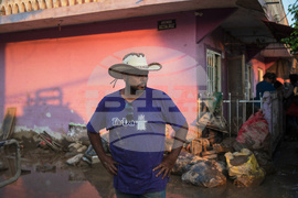 A man cleans a store at the main market in Poza Rica, Veracruz state, Mexico, Thursday, Oct. 16, 2025, after deadly floods and torrential rain. (AP Photo/Felix Marquez)