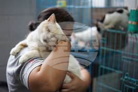 Rafaela Perez hugs Milagro, a rescued cat she cares for at the Hogar Buena Fortuna pet shelter, which she operates out of her home in Mejicanos, El Salvador, Monday, Oct. 13, 2025. (AP Photo/Salvador Melendez)