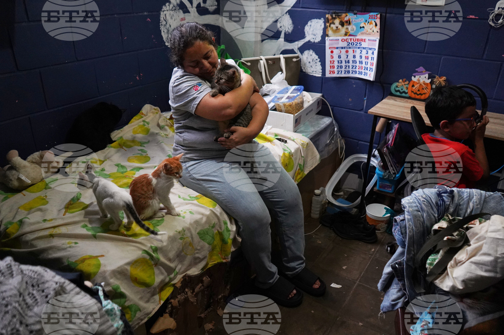 Rafaela Perez plays with a rescued cat who she cares for at the Hogar Buena Fortuna pet shelter, which operates from her home in Mejicanos, El Salvador, Monday, Oct. 13, 2025. (AP Photo/Salvador Melendez)