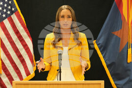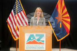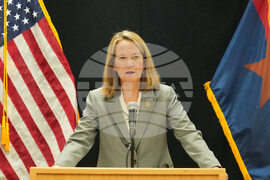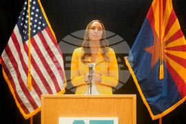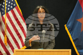 Arizona Attorney General Kris Mayes speaks about the execution of inmate Richard Djerf at the Arizona State Prison, Friday, Oct. 17, 2025 in Florence, Ariz. (AP Photo/Darryl Webb)