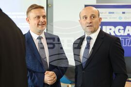 Бургас (17 октомври 2025) Третото издание на конференцията за изкуствен интелект, иновации и цифрова трансформация „Burgas Digital 2025“ се открива в Конгресния център на Морска гара. Тазгодишното издание на събитието се провежда под мотото „Изчисли бъдещето“ и събира на едно място представители на бизнеса, публичния сектор и академичните среди, за да обменят опит и представят най-новите решения в областта на цифровизацията и изкуствения интелект. На снимката: председателят на Управителния съвет на „DIGIHUB“ Петко Георгиев (вляво) и заместник-министърът на иновациите и растежа Мартин Дановски.
