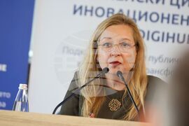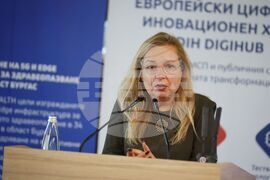 Бургас (17 октомври 2025) Третото издание на конференцията за изкуствен интелект, иновации и цифрова трансформация „Burgas Digital 2025“ се открива в Конгресния център на Морска гара. Тазгодишното издание на събитието се провежда под мотото „Изчисли бъдещето“ и събира на едно място представители на бизнеса, публичния сектор и академичните среди, за да обменят опит и представят най-новите решения в областта на цифровизацията и изкуствения интелект. На снимката: председателят на Икономическия и Социален Съвет Зорница Русинова.