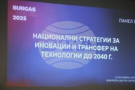 Бургас (17 октомври 2025) Дискусия на тема „Национални стратегии за иновации и трансфер на технологии до 2040 г.“ се провежда в Конгресния център на Морска гара. Събитието е част от програмата на третото издание на конференцията за изкуствен интелект, иновации и цифрова трансформация „Burgas Digital 2025“. Тазгодишното издание на форума се провежда под мотото „Изчисли бъдещето“ и събира на едно място представители на бизнеса, публичния сектор и академичните среди, за да обменят опит и представят най-новите решения в областта на цифровизацията и изкуствения интелект. На снимката:
