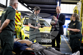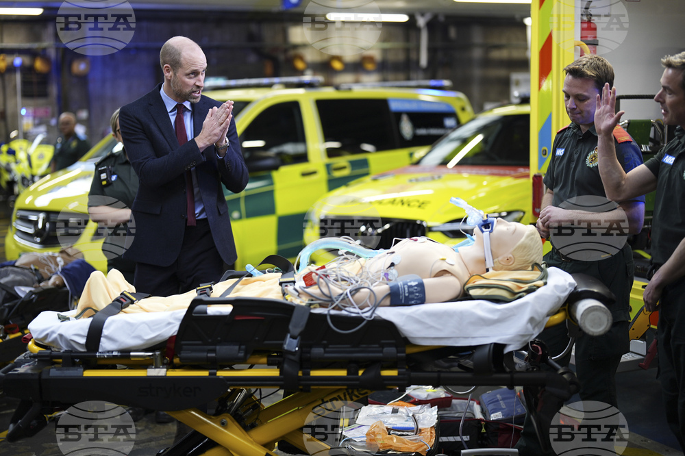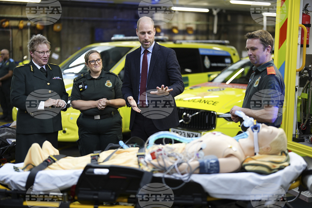 Britain's Prince William watches a training demonstration during a visit to the London Ambulance Service at its headquarters in London, Friday, Oct. 17, 2025. (Aaron Chown , Pool Photo via AP)