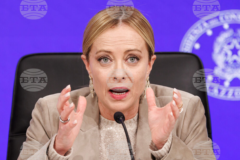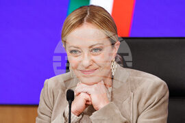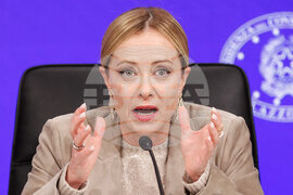 Italian Premier Giorgia Meloni meets journalists during a press conference following a Cabinet meeting on the budget law, in Rome, Friday, Oct. 17, 2025. (Roberto Monaldo/LaPresse via AP)