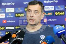 София (17 октомври 2025) Медийна среща преди финалния турнир за Суперкупата на България по волейбол за мъже с участието на Матей Казийски и национали се провежда в зала „Левски“ в Геритадж Парк. На снимката: старши треньорът на Локомотив Пловдив Найден Найденов.