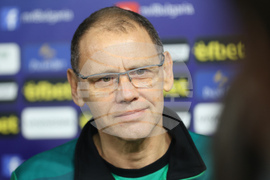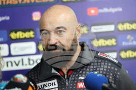 София (17 октомври 2025) Медийна среща преди финалния турнир за Суперкупата на България по волейбол за мъже с участието на Матей Казийски и национали се провежда в зала „Левски“ в Геритадж Парк. На снимката: старши треньорът на Берое Мирослав Живков.