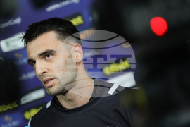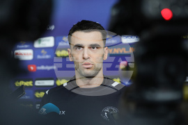 София (17 октомври 2025) Медийна среща преди финалния турнир за Суперкупата на България по волейбол за мъже с участието на Матей Казийски и национали се провежда в зала „Левски“ в Геритадж Парк. На снимката: волейболистът Калоян Балабанов.
