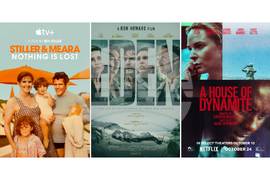 This combination of images shows promotional art for "Stiller & Meara: Nothing is Lost," left, "Eden," and "A House of Dynamite." (Apple TV+/Vertical Entertainment/Netflix via AP)