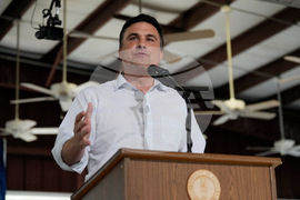 FILE - Rep. Andy Barr, R-Ky., speaks at the annual Fancy Farm picnic, Aug. 2, 2025, in Fancy Farm, Ky. (AP Photo/Mark Humphrey, File)