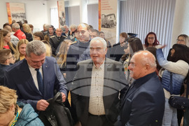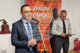 Перник (17 октомври 2025) С изложба и церемония по награждаване на победителите в конкурса за детска рисунка на тема „Храбри сърца“, в Перник отбелязват 100 години от създаването на местната пожарна команда. Събитието се провежда в партньорство между Регионална дирекция „Пожарна безопасност и защита на населението“ (РДПБЗН) и Регионалния исторически музей (РИМ) Перник, под патронажа на областния управител Людмил Веселинов. На снимката (от ляво надясно): съветникът на министъра на вътрешните работи Николай Николов, директорът на Регионална дирекция "Пожарна безопасност и защита на населението" - Перник Борис Борисов, директорът на Главна дирекция "Пожарна безопасност и защита на населението" главен комисар Александър Джартов, областният управител на Перник Людмил Веселинов, кметът на Радомир Кирил Стоев, народният представител от политическа партия ГЕРБ Стефан Маринов.