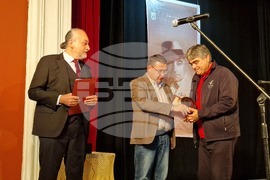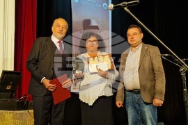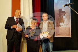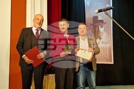 Свищов (17 октомври 2025) На галаконцерт в свищовското читалище тази вечер бяха връчени наградите в осмото издание на Националния фестивал за стари градски песни "Георги Бейков". Форумът, целящ да възроди и обогати градската песенна традиция, се организира от Община Свищов, Първо българско народно читалище „Еленка и Кирил Д. Аврамови – 1856” и семейството на Георги Бейков. На снимката: председателят на журито Пламен Бейков (вляво) и д-р Генчо Генчев, кмет на Община Свищов (в средата), връчват наградите.