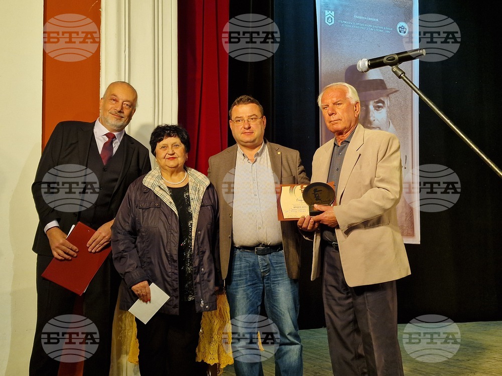 Свищов (17 октомври 2025) На галаконцерт в свищовското читалище тази вечер бяха връчени наградите в осмото издание на Националния фестивал за стари градски песни "Георги Бейков". Форумът, целящ да възроди и обогати градската песенна традиция, се организира от Община Свищов, Първо българско народно читалище „Еленка и Кирил Д. Аврамови – 1856” и семейството на Георги Бейков. На снимката: председателят на журито Пламен Бейков (вляво) и д-р Генчо Генчев, кмет на Община Свищов (вдясно), връчват наградите.