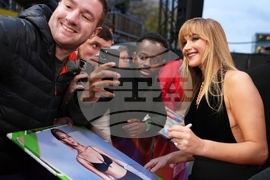 Jennifer Lawrence signs autographs and poses for photographs upon arrival at the premiere of the film "Die My Love" during the London film festival in London, Friday, Oct. 17, 2025. (Photo by Scott A Garfitt/Invision/AP)