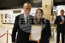 Благоевград (17 октомври 2025) Кметът на Община Благоевград дава прием във фоайето на Общинска администрация в чест на шампионите от Световното първенство по Таекуон-До ITF, което се проведе в Лидо ди Йезоло, Италия. Методи Байкушев връчи грамоти и медали на българските състезатели, които се завърнаха от Италия със седем титли и 23 медала. На снимката: кметът Методи Байкушев и Вяра Станкова.