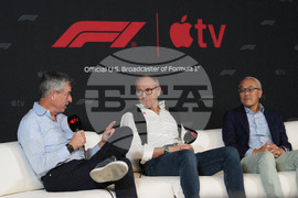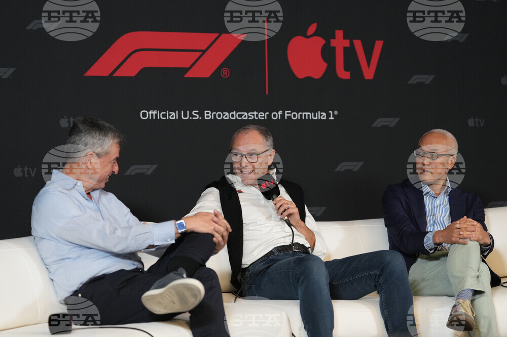 Apple's Eddy Cue, Senior Vice President of Services, left, F1 chairman Stefano Domenicali, center, and Derek Chang, CEO of Liberty Media, right, discuss a five-year partnership with Formula 1 and Apple TV to bring races to its streaming service beginning in 2026 during a news conference at the Circuit of the Americas in Austin, Texas, Friday, Oct. 17, 2025. (AP Photo/Eric Gay)
